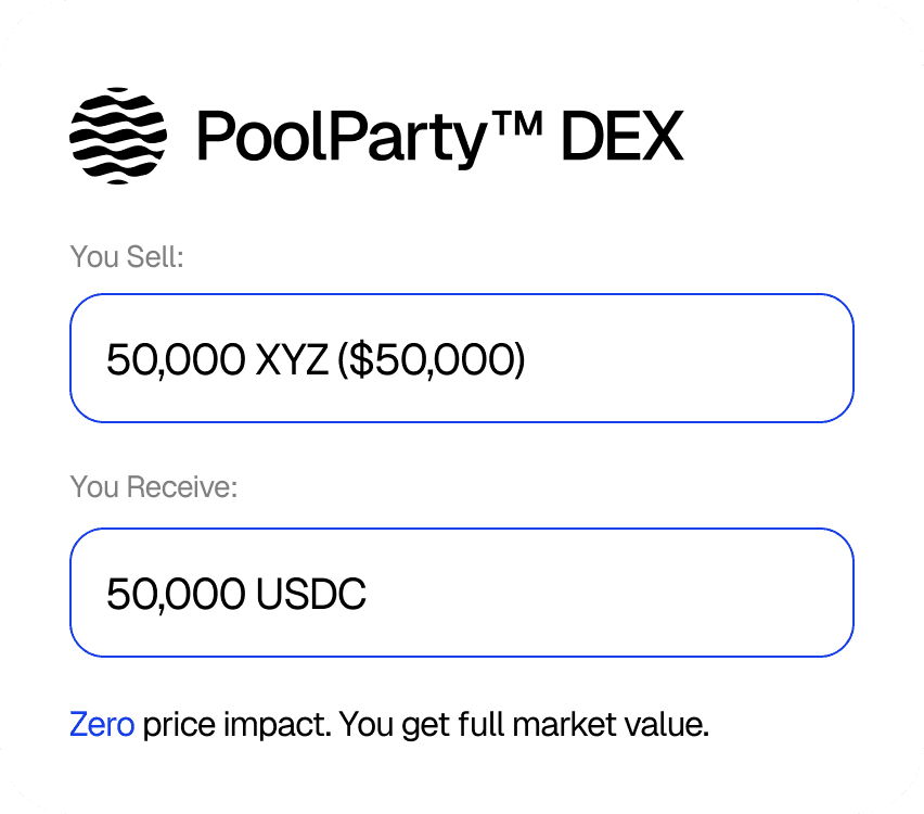 PoolParty™ uses intelligent order routing to find the most efficient path for every trade — delivering true market execution without the usual downsides of AMMs.